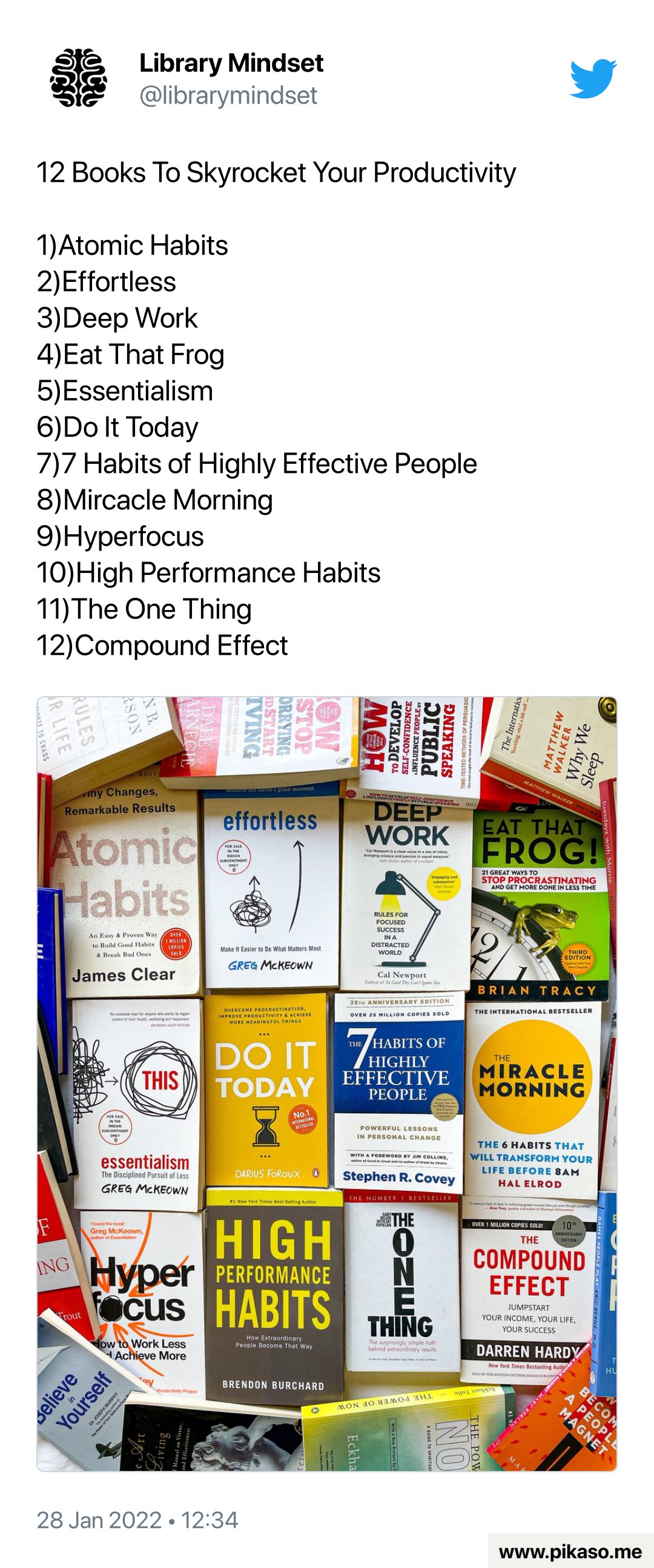 Library Mindset On Twitter 12 Books To Skyrocket Your Productivity 1 Atomic Habits 2 Effortless 3 Deep Work 4 Eat That Frog 5 Essentialism 6 Do It Today 7 7 Habits Of Highly Effective People 8 Mircacle Morning 9 Hyperfocus 10 High